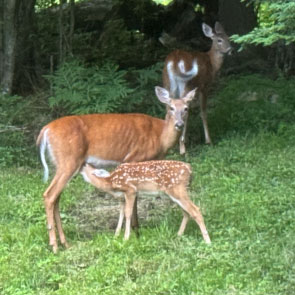Sweet White-Tail Fawn—Pat Mezzatesta snapped this photo of two does, one with her nursing white-spotted fawn, on the woods line at her home in French Woods. Animal young, including fawns and bear cubs, are an exciting and enjoyable sight to see this time of year.