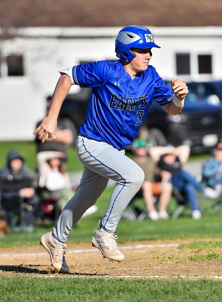 Noah Bass heads to first on a single against Afton on Monday, April 18. [photo by C. Ray]