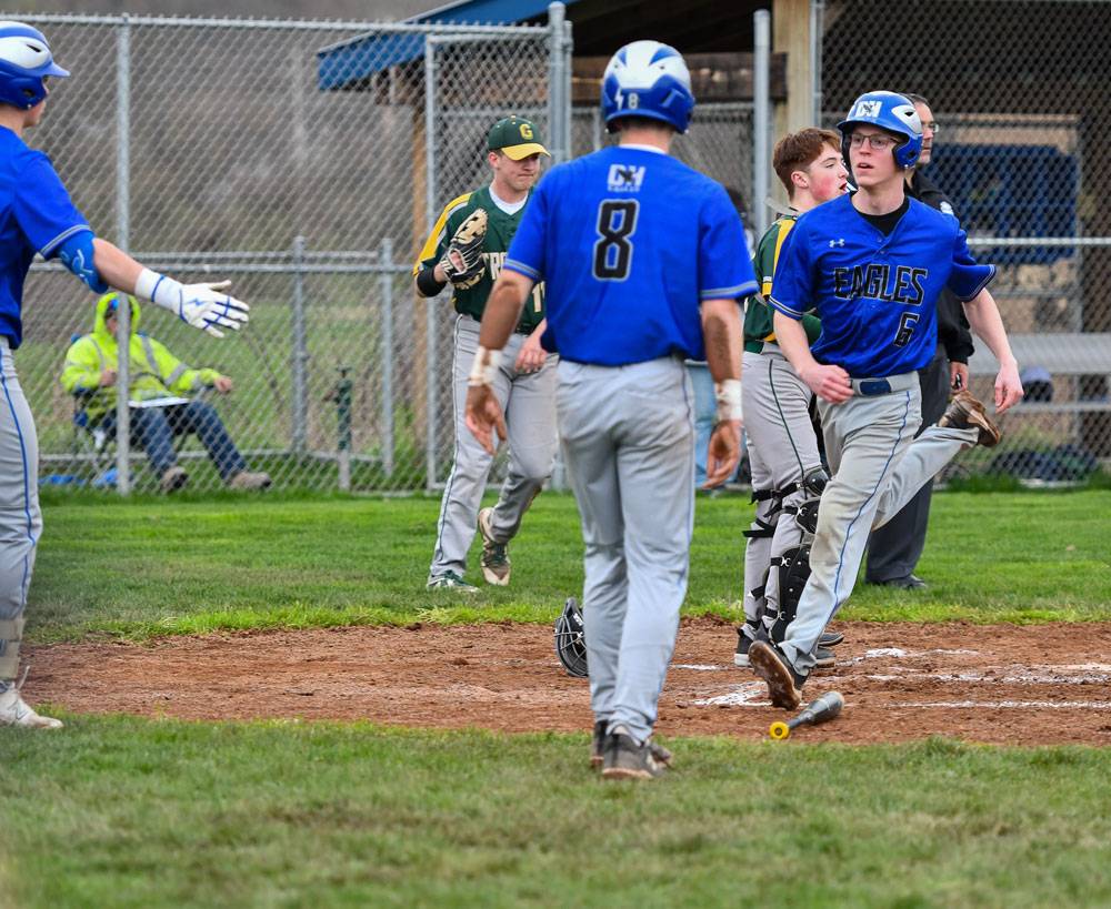 Logan Westbrook scores on a hit by Zech Begeal against Greene at Warner Field on Friday. [photo by C. Ray]