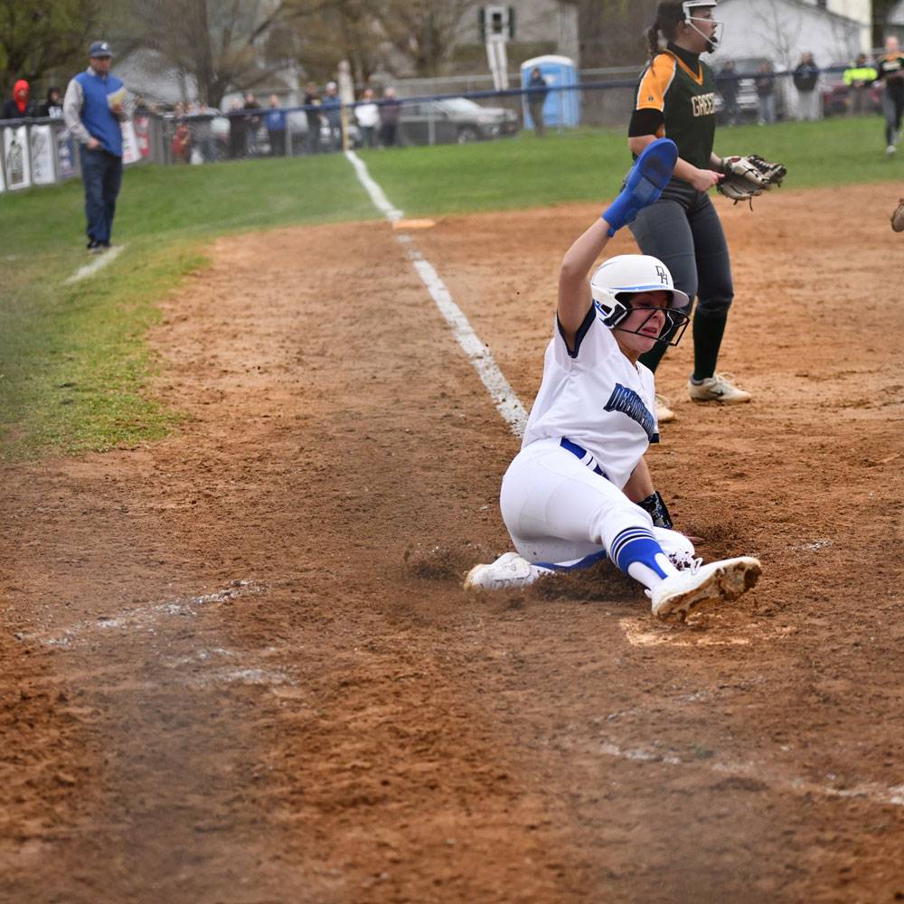Leah Wist slides home to score against Greene at a home match on Friday. [photo by C. Ray]
